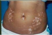局限型白癜风患者的皮损为局部色素脱失,白斑呈乳白色,其内毛发可变白或正常,但皮肤无其它变化,亦无自觉症状。由于缺乏色素的保护作用,曝晒后可引起灼 痛,红斑及水疱。白斑的数目不定,可局限于身体某部或分布在某一神经节段(或皮节),而很少变化或自行消失,但是多数病例往往逐渐增多,扩大,甚至可泛发 全身。色素脱失的程度因人而异,因部位而异,也可因脱色程度不同而显示白、灰白、近正常肤色三种色调。