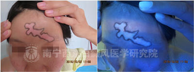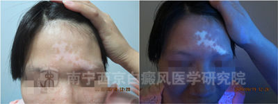 4、wood灯:灯下可见前额呈片状白斑,边界模糊不清。