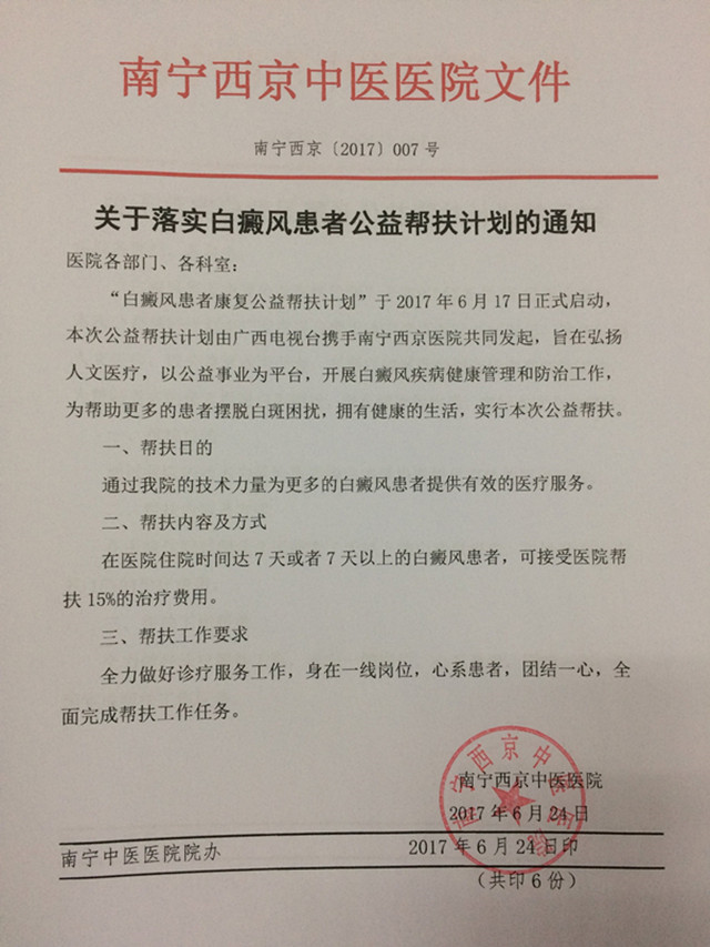 6月26日,经过国家监管部门审批,南宁西京白癜风医院“2017白癜风患者康复公益帮扶计划”审核通过,正式下达文件启动。